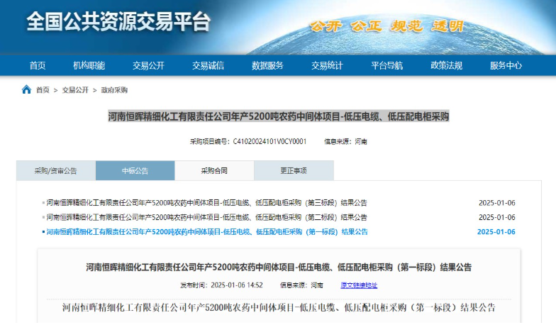 伊始,河南勝華電纜集團(tuán)捷報(bào)頻傳,小編還沉浸在河南勝華電纜榮獲河南省創(chuàng)新龍頭企業(yè)稱號(hào)的喜悅當(dāng)中,又從全國公共資源交易平臺(tái)發(fā)布的政府采購結(jié)果公告中獲悉,河南勝華電纜集團(tuán)有限公司中標(biāo)河南恒暉精細(xì)化工有限責(zé)任公司年產(chǎn)5200噸農(nóng)藥中間體項(xiàng)目-低壓電纜、低壓配電柜采購,中標(biāo)金額為2620618.00。