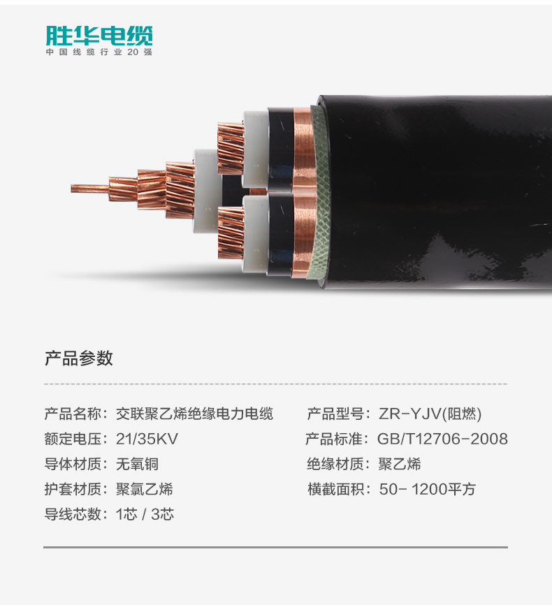 勝華電纜ZR-YJV-2135KV高壓阻燃交聯銅芯電力電纜